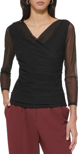 Sheer mesh brings casual elegance to this surplice-neck top gently shaped by ruching at the sides.