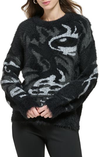 Swirling abstract shapes dance across a statement-making sweater flecked with metallic threads for cool-weather glamour.