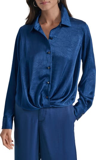 Cut from glossy crinkled satin, this polished shirt is made with a back box pleat for easy movement and a twisted front for a tucked-in look.
