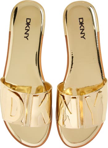 Metallic letters dominate the straps of a brand-loyal sandal with a slip-on design for quick outfit making.