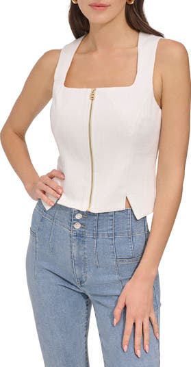 Angled cutout notches detail the front hem of a structured corset top punctuated by a geometric zip pull.