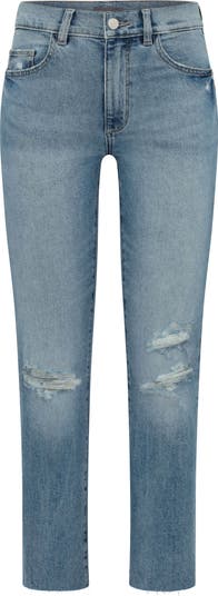 Vintage-inspired straight-leg jeans in a medium wash get an additional edgy touch from deconstructed details and cool frayed hems.
