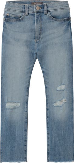 Perfect for school or the weekend, these casual jeans have a high waist, straight legs and stretchy denim with trendy distressed details.
