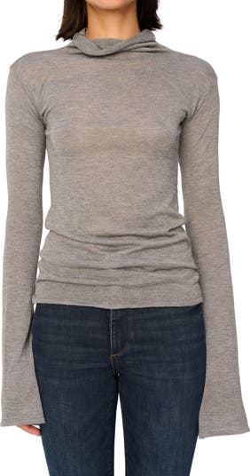 Bell sleeves and a drapey turtleneck lend an air of romance to this fine-gauge top knit from wool-enriched yarn.