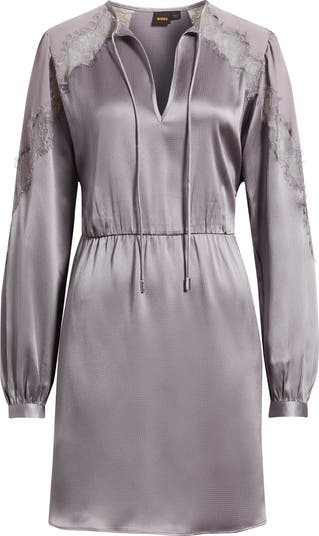 Satin graced with lace insets plays elegantly against the boho-inspired styling of this slip-on dress.