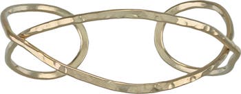 Double loop cuff bracelet in hand-hammered gold filled metal. Lightweight, sculptural, and striking.