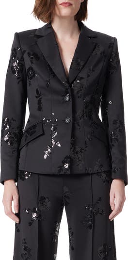 Shaping seams structure this polished night-out blazer illuminated with floral-patterned sequins.