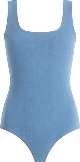 Stretch-enhanced denim ensures everyday comfort that moves with you in this square-neck bodysuit with a raw-cut back that disappears under clothing.