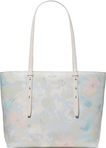 A dreamy floral print and smooth leather define a structured tote suspended from adjustable shoulder straps and designed with a roomy interior perfect for your daily necessities.