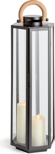 - This six panel lantern is made of stainless steel and natural teak handles. Impressive in scale, it is a great accent along the mantle, or on an entry console.