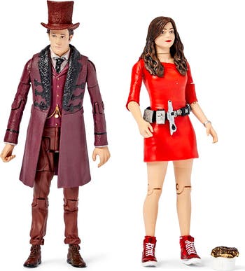 Presented here in the Impossible Set, together but apart, are the Eleventh Doctor in his iconic Victorian frock coat from The Snowmen, and Oswin Oswald, the Impossible Girl, in her iconic red dress from "Asylum of the Daleks." The Doctor's outfit features his top hat and jacket with fur and brocade detailing. Oswin's outfit is a one piece red dress with her souffle-making accessory belt. The 5-inch figure set is presented in a unique double sided foil embellished Sand Diego Comic Con collector pack with 'peephole' Dalek eye window on one side and a Victorian winter vista on the other.