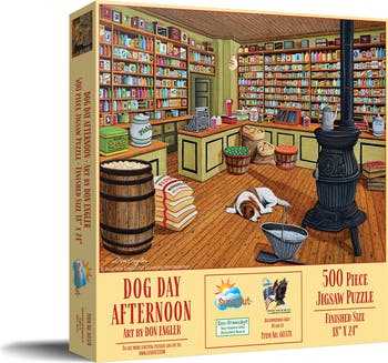 SunsOut Inc.’s Dog Day Afternoon 500-piece jigsaw puzzle, featuring artwork by acclaimed artist Don Engler, immerses you in the quintessential charm of Americana. With a completed size of 18" x 24", you can piece together a heartwarming rural scene that offers hours of entertainment and relaxation. Made in the USA, SunsOut puzzles are known for their high-quality, with each piece crafted from recycled cardboard and intricately interlocking for a smooth puzzle experience. Each puzzle piece is printed with soy-based inks for vibrantly safe and environmentally friendly colors. SunsOut's commitment to sustainability coupled with their exquisite designs reflect their dedication to caring for our planet. As a woman-owned small business, SunsOut ensures each of their jigsaw puzzles meets the highest manufacturing standards and offers a worry-free guarantee. This unique puzzle also serves as a thoughtful gift for puzzle enthusiasts and Americana fans, offering a way to unwind and engage the mind. The Dog Day Afternoon is more than just a puzzle—it's a vibrant piece of artwork and a nostalgic experience that brings families together. Dive into the captivating challenge and explore the charm and quality of this exceptional jigsaw puzzle today!