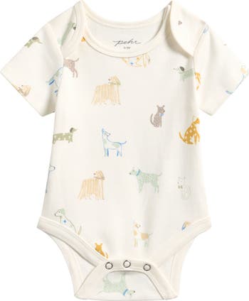 A playful canine print enriches a comfy organic-cotton bodysuit made with an envelope neck and easy snaps to make changes a breeze.