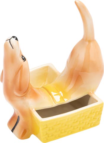 - Adorable stoneware planter shaped like a retro-style dog, hand-painted in warm brown, soft yellow, and creamy white tones