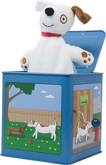 - CLASSIC OLD SCHOOL TOY, Jack in the Box has been redone with modern artwork and cuddly puppet. Featuring a unique art style and a plush character, Jack The Dog. Kids and adults love this classic toy.
