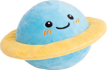 SNUGAROOZ: 2-IN-1 - SOOTHING SATURN - Your pup will surely have 2x fun with this galactic 2 in 1 toy! Inside you will find a fun, spikey TPR ball for added fun. Soothing Saturn is a charming, cool blue plush sphere surrounded by an inviting, halo-yellow ring. Not only does it bring joy, but your canine companion can also feel good that their new plush toy is made from recycled water bottles and contains eco-friendly squeaker and crinkle material for hours of entertainment! THE PERFECT PLUSH FOR TINY CHEWERS: A durable, compact plush toy designed for small dogs and puppies. Made from soft yet sturdy fabric, it's gentle on gums and perfect for satisfying their chewing instincts. FUN DETAILS: Rubber ball inside. Embroidered details. Built-in squeaker. Crafted from recycled water bottles. Soft cotton texture. Crinkle paper. DIMENSIONS: 4 x 7 inches. MADE FROM RECYCLED WATER BOTTLES: Plastic bottles sorted for quality. Bottles are broken down and washed. Raw material is turned into a fiber. Then used for the stuffing of your beloved toys. Saving the planet one toy at a time! SnugArooz plush toys are crafted to squeak and crinkle their way into every furry heart. Snuggle. Cuddle. Play.