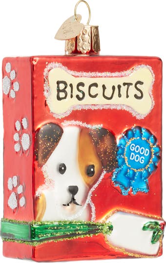 Add a playful touch to your holiday decorations with this glitter-trimmed, hand-painted dog biscuit box glass ornament.