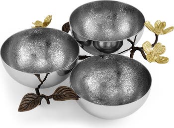 Bring a sense of nature to your table with this artistic set of serving bowls designed with reflective metal and dogwood-inspired carved branches featuring flower-shaped gilded ends.