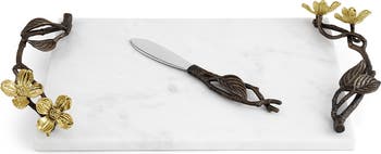 A cool slab of marble sets the stage while sculptural metal dogwood branches cradle the platter and a matching knife glides through your cheese of choice with garden-party charm.