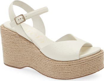 Tightly woven raffia envelops the sky-high platform and heel on a lofty leather sandal detailed with a V-cut topline and adjustable ankle strap for a secure fit.