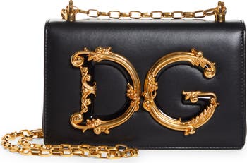 A Dolce&Gabbana logo embellished with Baroque-inspired gilt flourishes brings a vintage aesthetic to a structured crossbody bag crafted of smooth leather.
