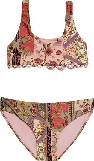Scalloped edges and a bold placement print will have your kiddo feeling like they're on vacation in this two-piece swimsuit.