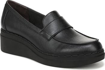 A chunky platform and integrated wedge heel add walkable height to a streamlined loafer featuring cloud-like cushioning and a traction sole for optimal comfort and stability.