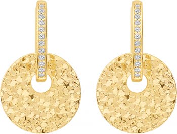 These modern 14-karat gold-plated drop earrings feature bold hammered round disks dangling from radiant pavé cubic zirconia huggie hoops.