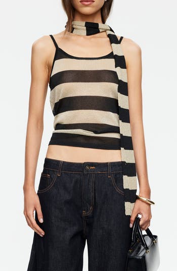 A matching scarf adds a fun flourish to a sparkly camisole that's covered in bold stripes.