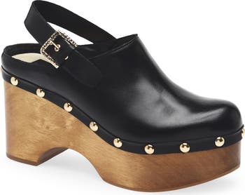 A textured buckle and stud hardware add sophisticated finishing touches to this retro-chic clog elevated on a chunky wood-grain platform.