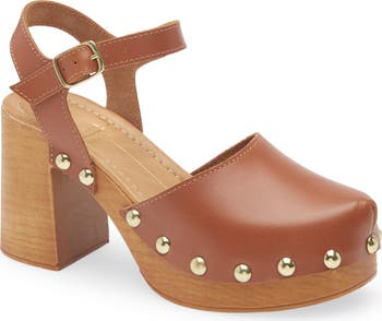Polished studs highlight the wood-grain platform and block heel of this retro-chic ankle-strap clog.