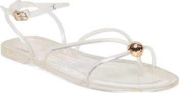 Polished hardware adds a touch of sophistication to a jelly sandal that's a retro style standout.