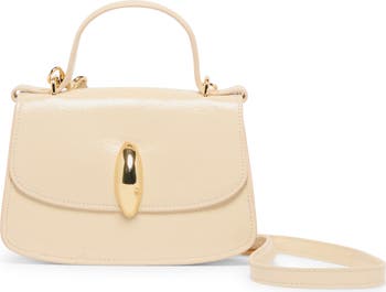 Gleaming hardware highlights the structured profile of a scaled-down bag made from textured faux leather featuring a divided interior and optional crossbody strap.