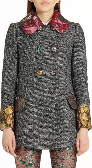 Mismatched buttons and swaths of colorful jacquard add vintage charm to this beautifully tailored coat sewn from a richly textured salt-and-pepper tweed.