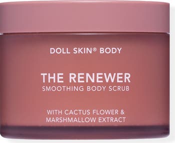 Dollskin™️Body the Renewer Smoothing Body Scrub with Cactus Fruit & Marshmallow Extract is a decadent, luxurious, clean body scrub formulated with skin-loving, natural ingredients that help reduce the appearance of dry skin and improve the look of fine lines and crepiness. Powered by Cactus Flower, Marshmallow Extract, Hyaluronic Acid, Lipids, Peptides and Coconut Oil, this sugar scrub will smooth away the appearance of skin texture revealing brighter, younger looking skin. Intentionally Clean. Cruelty-Free. Safe for Sensitive skin.