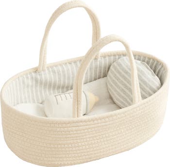 - Includes cotton carrier, matching mattress, pillow, blanket and plush bottle