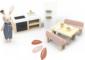 Includes 4 chairs for a complete kitchen experience. Crafted from durable wood (FSC certified), ensuring longevity and safety for children aged 3y and above. Character is made of linen.