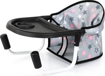 DOLL TABLE SEAT: GREY, PINK, STARS - The Doll Table Seat is the perfect accessory for little caregivers who love to include their dolls in everyday activities. Suitable for dolls up to 46 cm (18 inches), this modern seat attaches securely to most tables, allowing dolls to “join” mealtimes and playtime gatherings in a fun and realistic way. The integrated dining tray with cup holder makes pretend feeding easy and enjoyable, whether it’s breakfast, lunch, or snack time. Its sturdy yet lightweight construction ensures stability during play, while the contemporary design adds a stylish touch to any doll accessory collection. Practical and portable, the seat folds flat within seconds for compact storage and convenient transport. Its handy size makes it perfect to take along on family outings, vacations, or playdates, ensuring a favorite doll always has a place at the table. More than just a toy, the Doll Table Seat encourages creativity, imagination, and nurturing role play. By letting dolls share in everyday routines, children can practice independence, empathy, and social interaction while enjoying hours of engaging play.