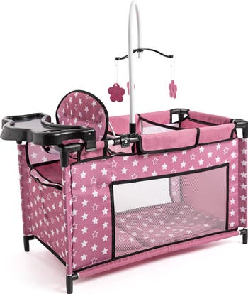- FULL DOLL CARE CENTER: The Doll Multi Bed Set in pink with stars fits dolls up to 18 inches and combines sleeping, feeding, and changing features. Its cheerful design makes every playtime realistic, fun, and engaging.
