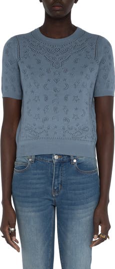 Sweet meets subversive in this soft cotton sweater, where hearts, stars and bandana-inspired paisley motifs play against Zadig & Voltaire’s signature wings, lightning bolts and skulls—all in intricate pointelle stitching.