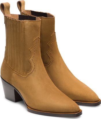 Western details provide a distinctive update for this block-heel Chelsea boot fashioned from rich suede.