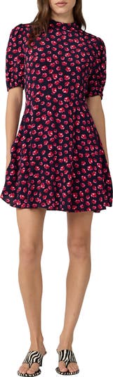 A scattered print enlivens this mock-neck minidress framed by subtly puffed sleeves and a gently flared skirt.