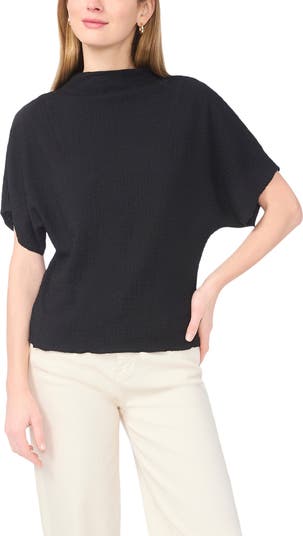 Drapey dolman sleeves frame this textured sweater topped with a funnel neck.