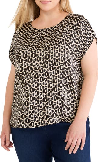 A back pleat enhances the easy drape of this printed dolman-sleeve top cut from signature glossy fabric.