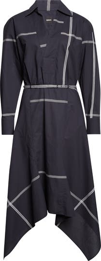 Placed ribbon details and a twirlable hem add charm points to a polished dress cut from crisp cotton.
