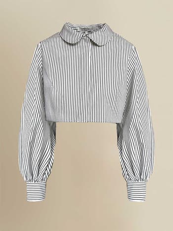 A cropped shirt in striped fabric with long sleeves and a peter pan collar. Made in NYC.