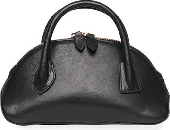 Geometric handle tabs and a dome-inspired profile bring architectural intrigue to an Italian leather bag shaped in an East/West silhouette and suspended from a pair of rolled top handles.