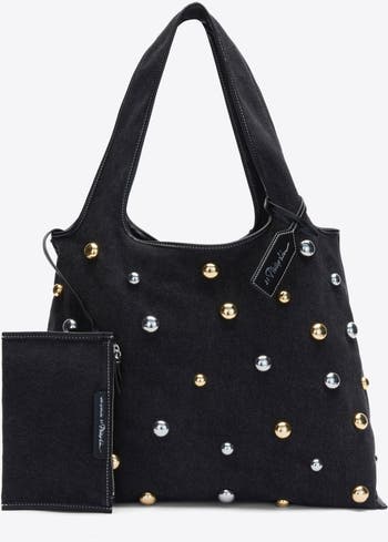 A modern icon with attitude. The Market Tote returns in washed denim, elevated with mixed metal dome studs that bring texture and shine. Designed with wide shoulder straps and a spacious silhouette, it's both functional and statement-making. Comes with attached zip pouch for added versatility—everyday ease with a bold edge.