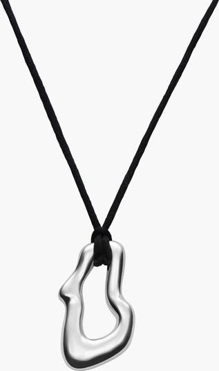 A sculptural dome pendant with elegant wavy contours, crafted from silver-dipped brass. Suspended from a sleek black cord, it blends modern minimalism with timeless charm for a refined everyday statement. Find more of our necklaces for woman in gold and silver.