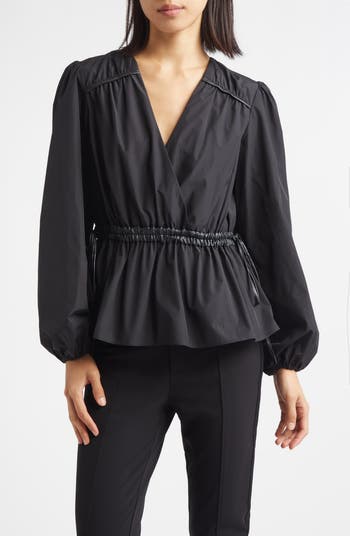 Faux-leather touches add chic contrast on a surplice top designed with a ruched drawstring waist and flippy peplum.